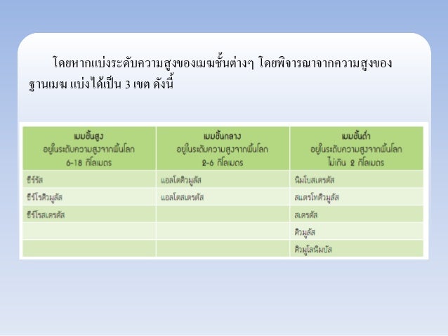 6. โดยหากแบ่งระดับความสูงของเมฆชั้นต่างๆ โดยพิจารณาจากความสูงของ ฐานเมฆ แบ่งได้เป็น 3 เขต ดังนี้