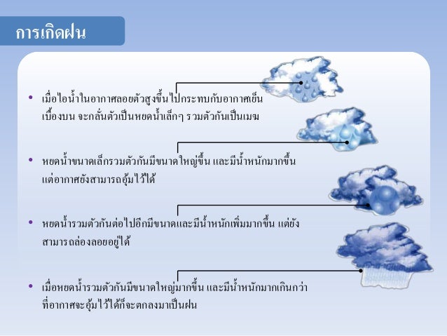 7. การเกิดฝน เมื่อไอน้า ในอากาศลอยตัวสูงขึ้นไปกระทบกับอากาศเย็น เบื้องบน จะกลั่นตัวเป็นหยดน้า เล็กๆ รวมตัวกันเป็นเมฆ หยดน้า ขนาดเล็กรวมตัวกันมีขนาดใหญ่ขึ้น และมีน้า หนักมากขึ้น แต่อากาศยังสามารถอุ้มไว้ได้ หยดน้า รวมตัวกันต่อไปอีกมีขนาดและมีน้า หนักเพิ่มมากขึ้น แต่ยัง สามารถล่องลอยอยู่ได้ เมื่อหยดน้า รวมตัวกันมีขนาดใหญ่มากขึ้น และมีน้า หนักมากเกินกว่า ที่อากาศจะอุ้มไว้ได้ก็จะตกลงมาเป็นฝน